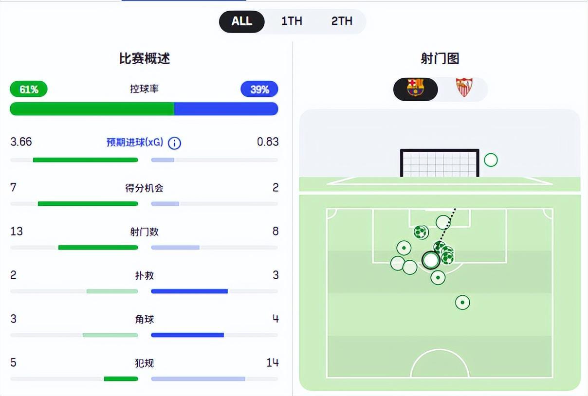 从巴萨5比2击败塞维利亚的比赛看,预期进球上巴萨3.66比0.83占据绝对优势,绝佳得分机会是7比2。