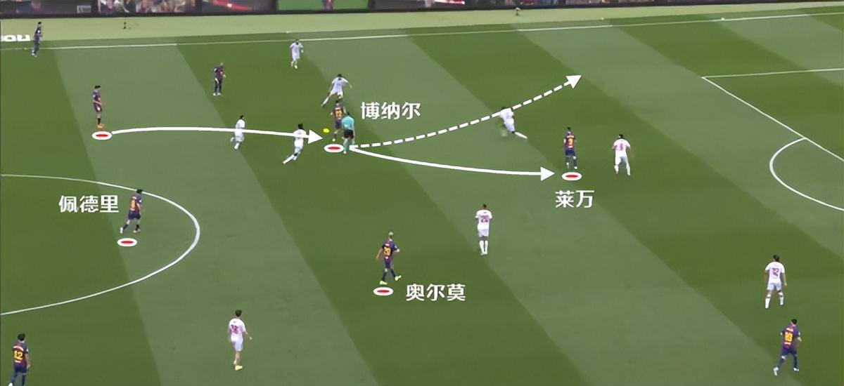 博纳尔在比赛中有很多的前插参与进攻,传球给到莱万之后,他还有一个往禁区侧翼跑的移动。